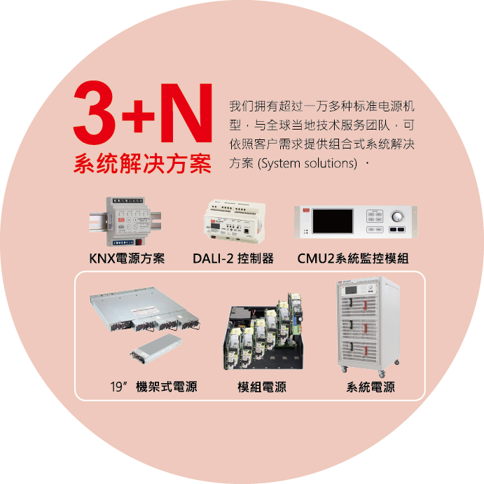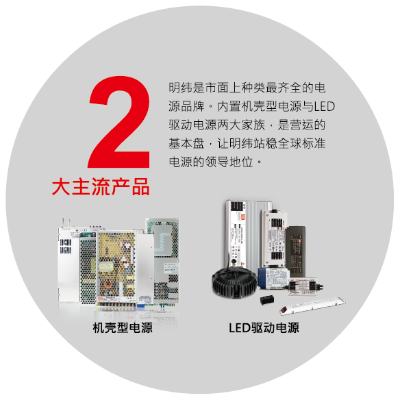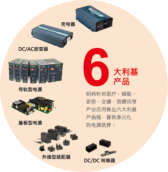 明緯秉持著持續創新的精神,每年新增10%新品,至今提供全方位之電源供應器產品,瓦特數涵蓋 0.5W~25,600W,主要產品類別有 AC/DC 電源供應器、LED驅動電源、AC/DC 充電器、DC / DC轉換器和DC / AC 逆變器,提供廣泛產品類別以滿足不同產業客戶之應用需求。