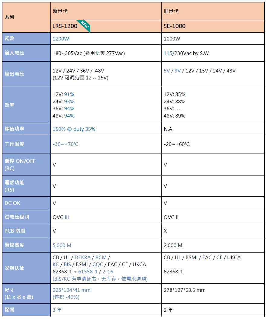 明緯全新系列LRS-1200,在尺寸、效率、規格、安規、耐用性及價格…等方面均有顯著提升,性價比更高,可完全取代 SE-1000系列。新品 vs 舊品詳細規格差異如下表: