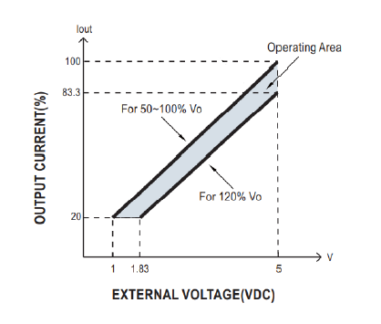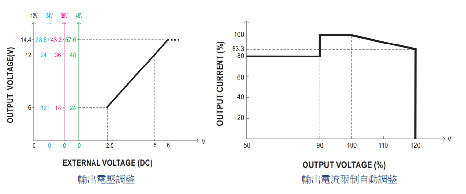 如圖二輸出電壓控制曲線所示,UHP-1000輸出電壓可以透過直流電壓訊號2.5V至6V,讓輸出電壓于額定電壓50%至120%范圍內進行調整。在使用PV功能時,最大輸出電流限制會根據設定的輸出電壓進行自動調整,建議客戶依輸出電壓需求執行相關降載要求,以防止產品過熱或觸發保護。