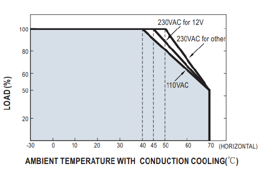 自然對流冷卻是消散電源運轉過程中產生之熱能的最便捷方式,由于沒有使用風扇,因此不會發出吵人的噪音,同時電源內部也不會有灰塵被吹入。根據圖四的降載曲線,該解決方案適用于額定功率低于60-70%的負載,為了使氣流在設備中確實流通,應注意其上方的間隙距離要有10cm,對于更高的功率需求,強制風冷和傳導冷卻則較為合適。