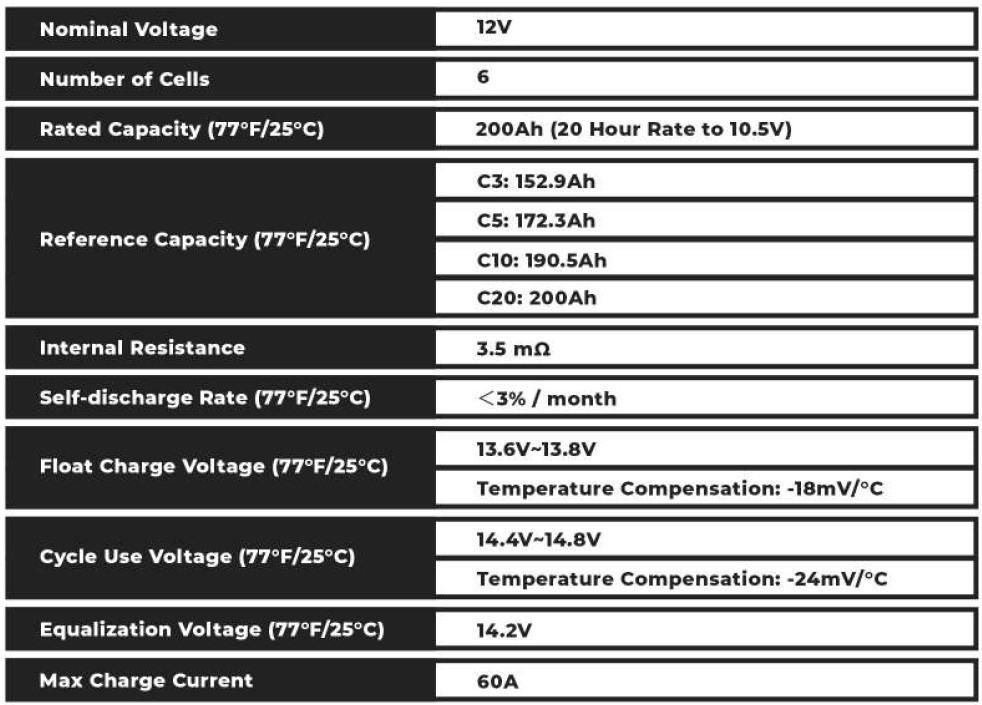 此案例應用在12V/200Ah鉛酸電池的充電,鉛酸電池的規格如下。