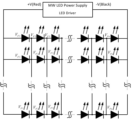 在發展高功率LED燈具的初期,由于LED芯片制程與材料容易影響LED順向電壓差異,會如圖1于每回路LED燈串搭配線性恒流源,確保每回路的電流大小,以提升燈具壽命;通常此恒流源會采用恒流IC架構或搭配DC - DC LED驅動器。隨著LED制程優化并降低LED順向電壓差異與高效率燈具需求,現今高功率燈具如圖2多采用直接驅動;DC - DC LED驅動器則轉向移動照明、太陽能路燈、集中供電等應用。