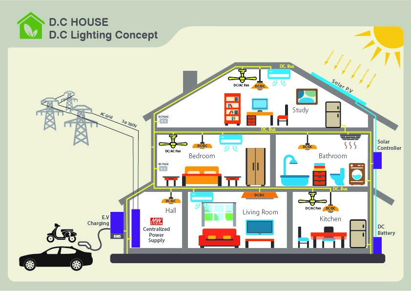 隨著環保意識抬頭,以及節能減碳的需求,未來電動車以及綠能會越來越普及;高壓直流集中供電有可能成為未來供電的方式。如圖3示意圖,房間內架構高壓直流供電總線,其來源可以選用明緯推出的高壓輸出機型UHP-1500-HV系列或RST-7K5-HV系列;輸出電壓選用380VDC,除了供應電動車快速充電與房間內各設備使用之外,同時也可以搭配降壓式DC – DC LED驅動器NHDD-40系列,作為房間內的照明燈具驅動使用。