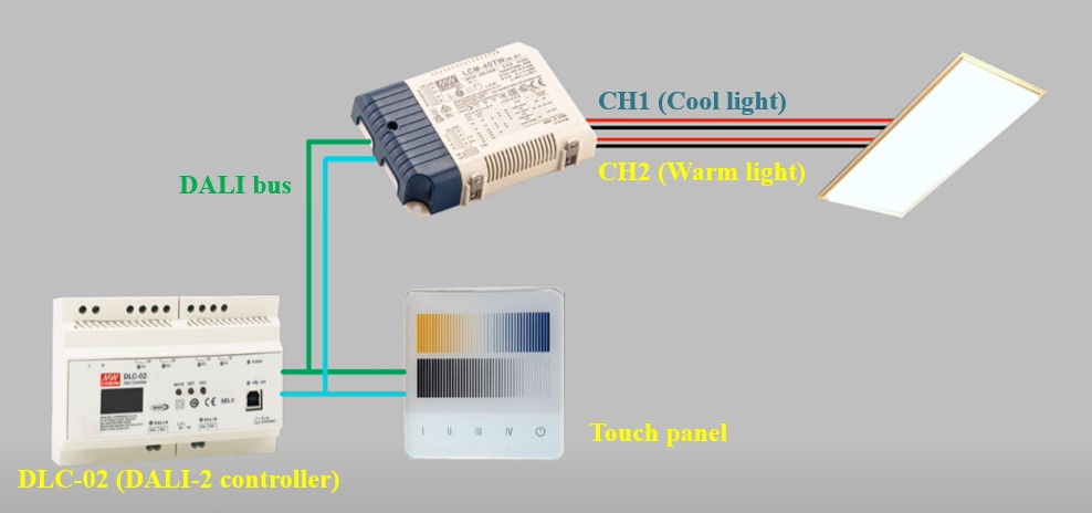 為滿足市場應用需求,明緯最新推出一款符合DALI-2的LCM-40TW可調色溫和亮度的智能電源,結合明緯DLC-02 DALI-2控制器,搭配DALI-2輸入設備(如觸摸面板、存在傳感器等),為室內智能照明系統提供最佳解決方案,如下圖五為DALI-2智能照明配置圖。