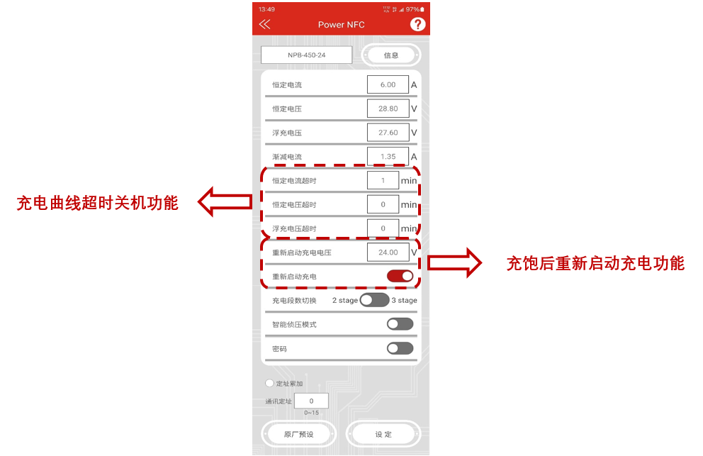 如圖 2 所示,除了基本的恒定電流 CC、恒定電壓 CV、浮充電壓 FV、漸減電流 TC 等參數可透過手機 APP 接口設定外,還有充電曲線超時功能與充飽后重新啟動充電功能可以設定。另外,基于安全性問題,NPB-450-NFC 也支持密碼功能。