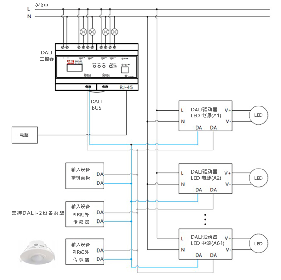 DLS-2XX紅外線移動感應器結合DLC-02控制器,DALI觸控面板以及LED驅動電源形成一個完整的DALI-2智能照明系統解決方案。透過標準化數位通訊架構,不僅提升系統穩定性,也大幅簡化設計、安裝與后續維護。