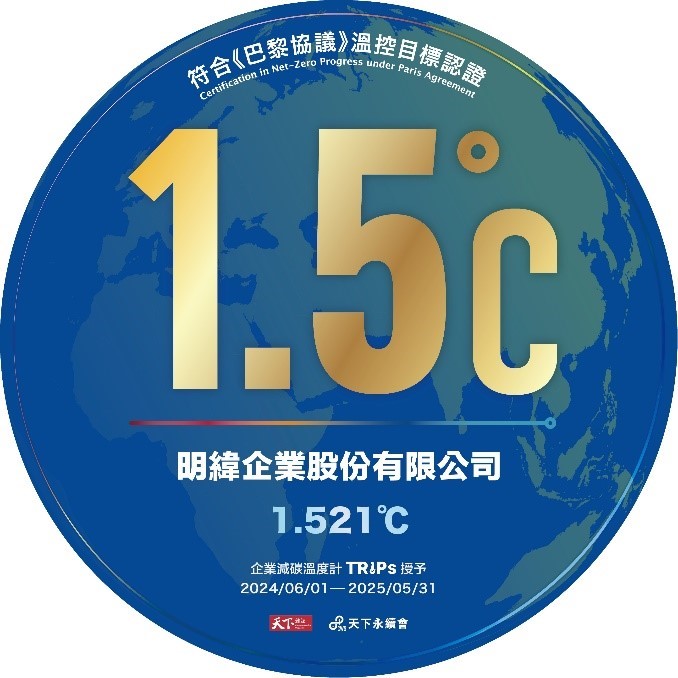 「企業減碳溫度計」(Temperature Rising Index for Pathways, TRIPs)由天下雜志與東海大學企業永續影響力中心共同發布,采用聯合國政府間氣候變化專門委員會(IPCC)發布之地球升溫情境,將全球升溫潛勢模型(Absolute Global Temperature Potential, AGTP)應用在企業的溫度評分。以企業自定義的減碳與凈零目標,仿真升溫數據,即為企業未來減排路徑的溫度。明緯經此模型推算溫度評級為1.521°C,符合于巴黎協議升溫1.5°C控制目標,更遠低于臺灣制造業2.79°C的平均溫度評級。